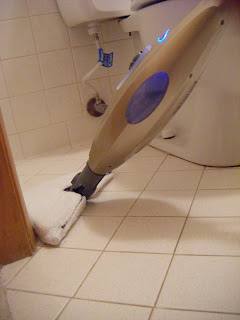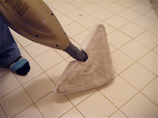 Commence water pouring. How else did you think we were going to make some steam? I used the triangular pocket mop for our tiny little bathroom floor.