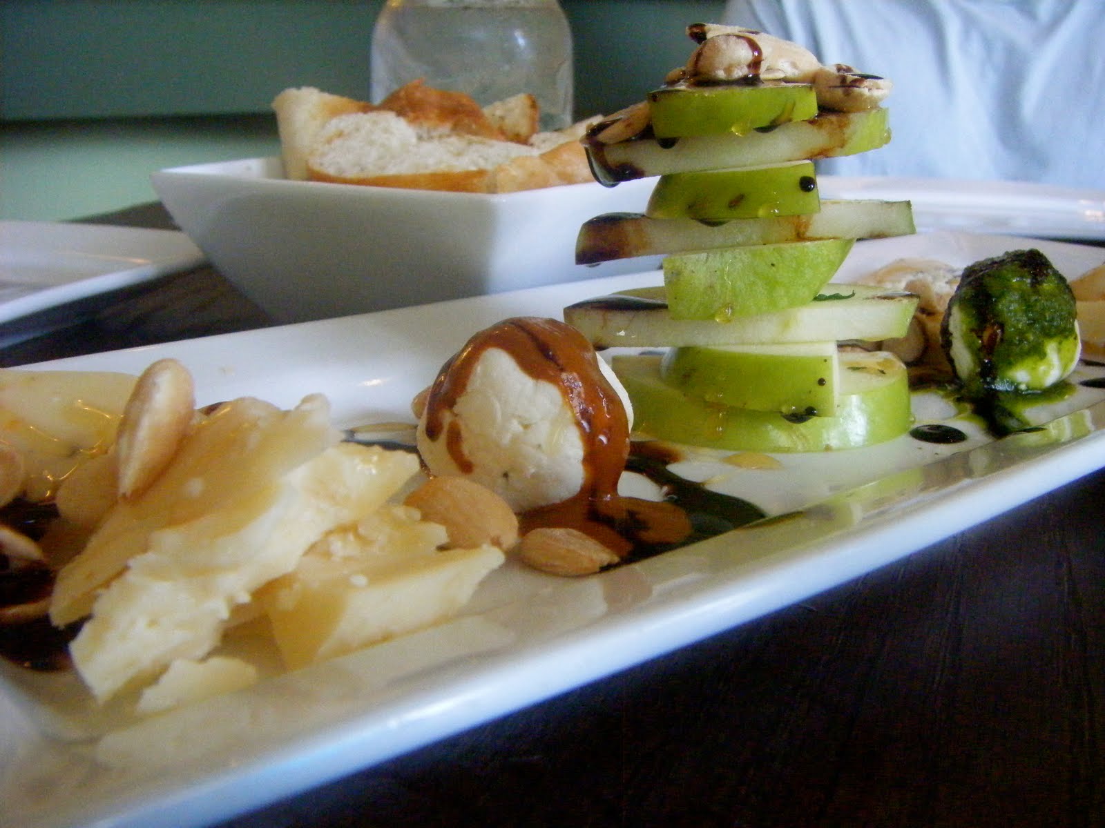 There were 4 kinds of raw cheeses (aged Cheddar, Asiago Peppercorn, St. Jerome and one other I can’t recall), 2 goat cheeses (one with a pesto sauce and the other with some sort of delectable chili sauce), almonds, Granny Smith apples, balsamic and toast.