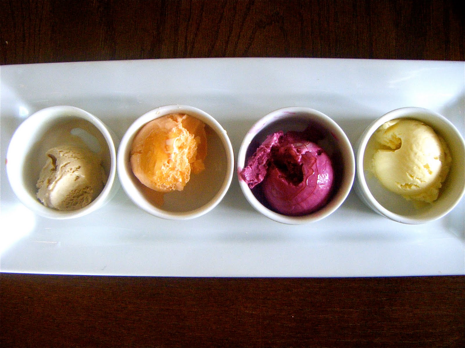 We opted for the sampler (Because variety is the spice of life! Or something like that….) From left to right, we had: Ethiopian Coffee Cinnamon, Carrot Ginger, Honey Beet and (my favorite) Lemon Goat Cheese. The Lemon Goat Cheese tasted just like Lemon Meringue Pie!