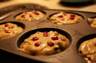 The inspiration for the muffins came from having extra pomegranate arils left over from our Pomegranate Pear Quesadillas last night, then having a friend over for breakfast this morning.
